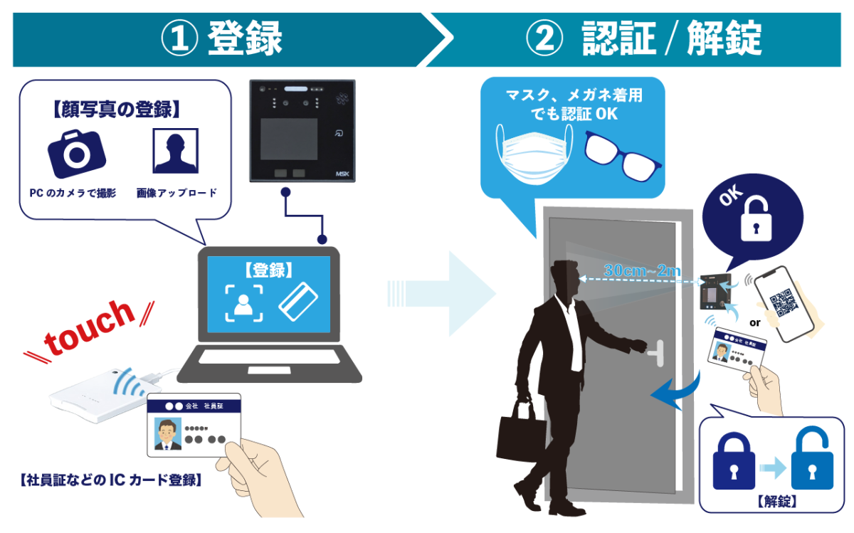 ⇒ マスク着用のまま非接触で高速認証ができ、ICカードとの二要素認証で厳格な権限管理が可能です